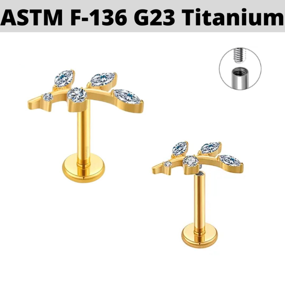 G23 Gold PVD Titanium Internally Threaded 5 CZ Leaf Tragus Labret