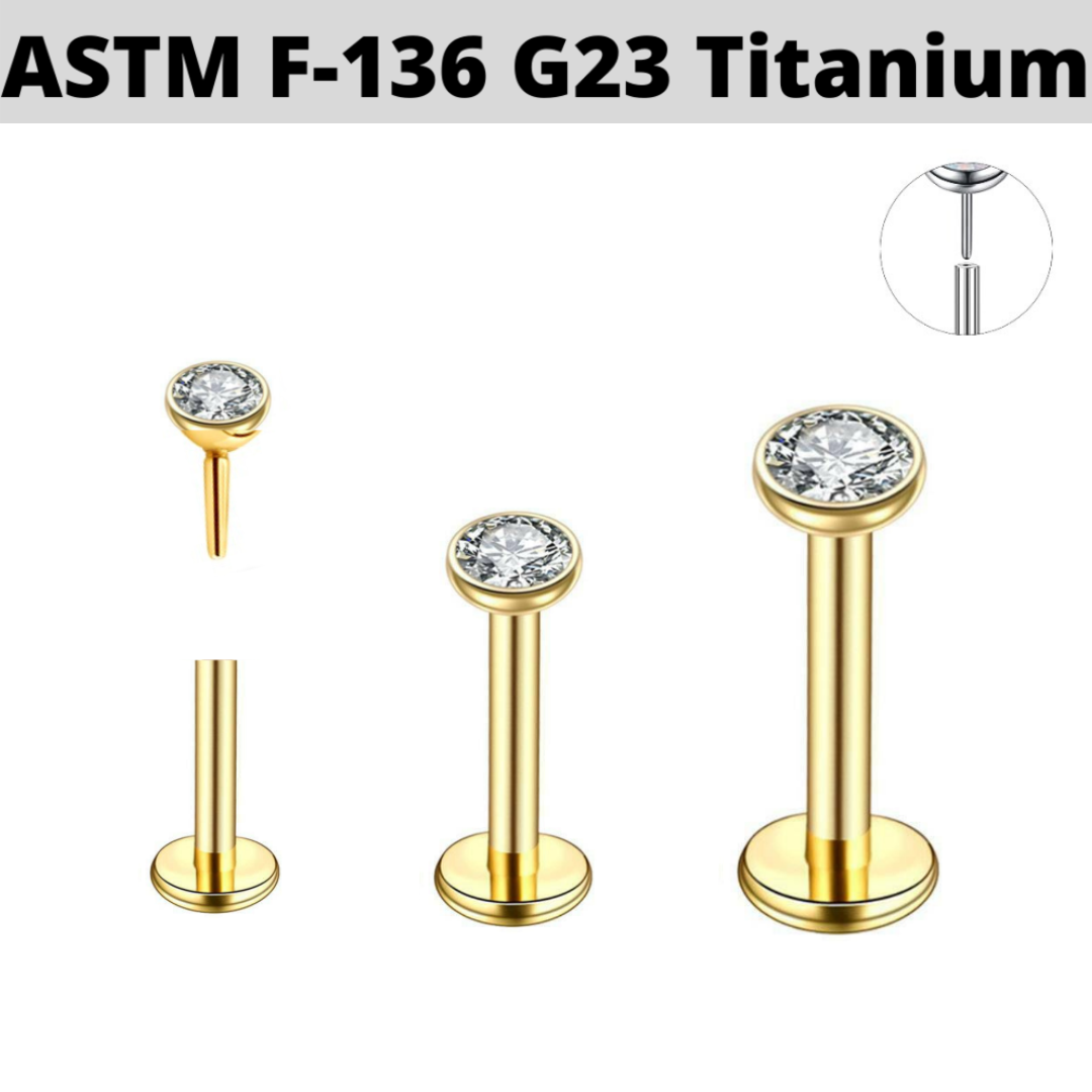 G23 Gold PVD Titanium Threadless Push In Flat CZ Tragus Labret
