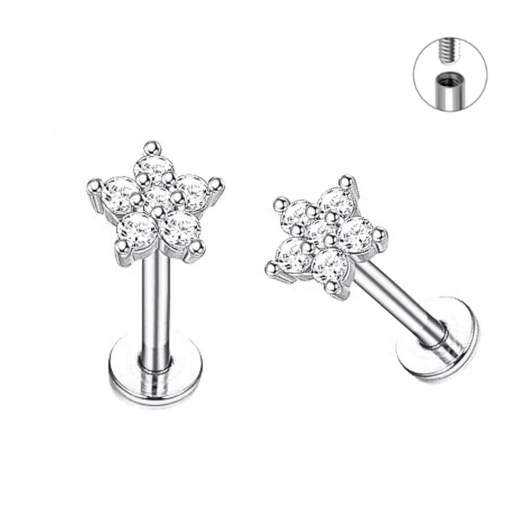 Internally Threaded Steel 6 CZ Flower Tragus Labret